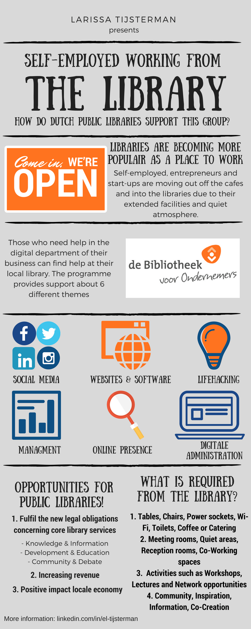 This project examines how the Dutch public libraries accommodate the growing group of small business owners and self-employed who set up an office in the local libraries.